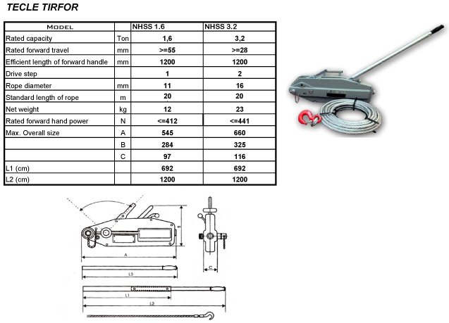 tirfor eléctricos, tirfor con motor diesel, tecles tirfor a cable de hasta 5,4 toneladas, carros portatecles, tecles antichispa, monorrieles,